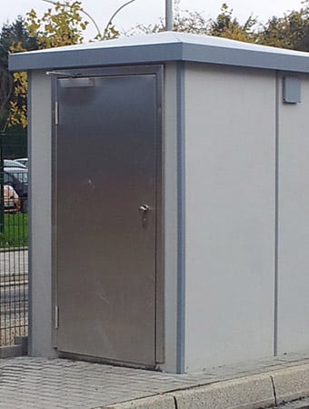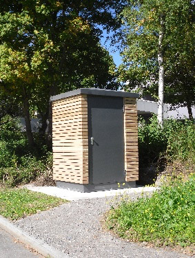 Eine Personaltoilette an einer Wartehalle am Wegesrand