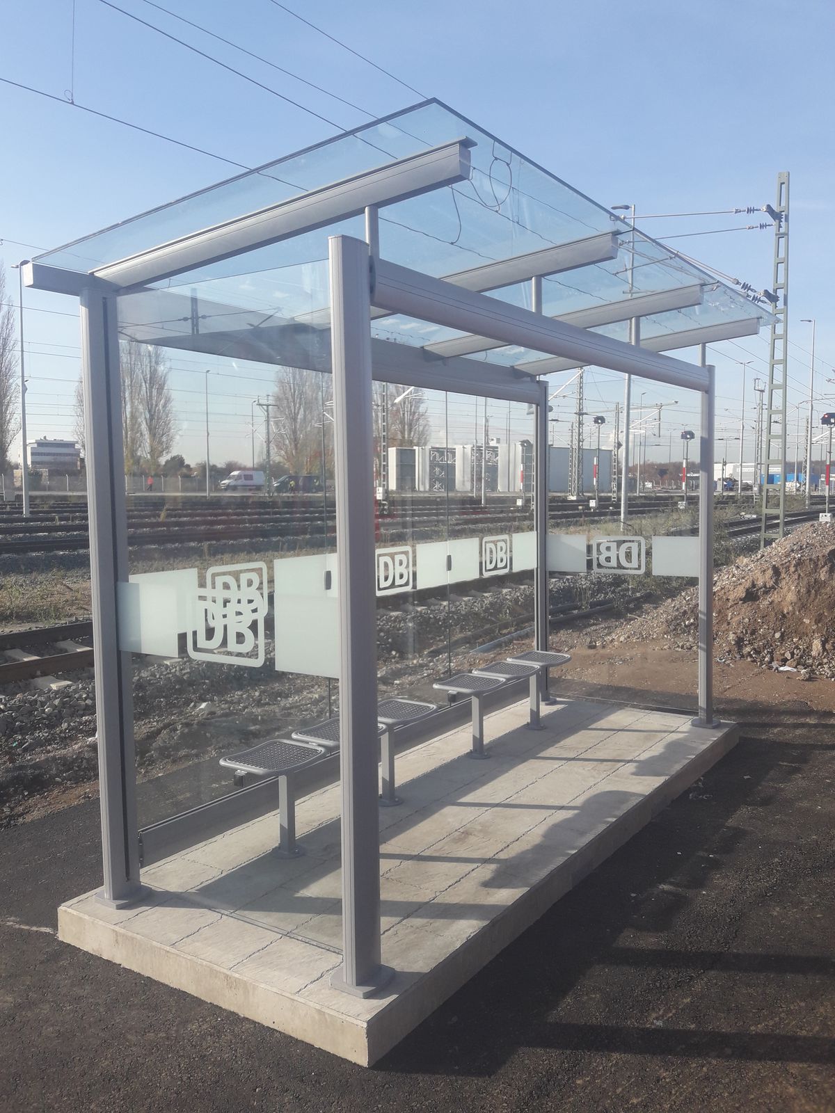 3-feldrige Ausführung als transportable Wartehalle mit oberflächenstrukturierter Beton- Bodenplatte
